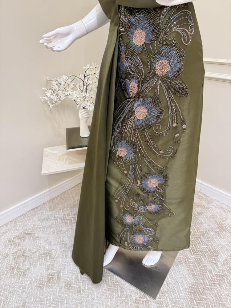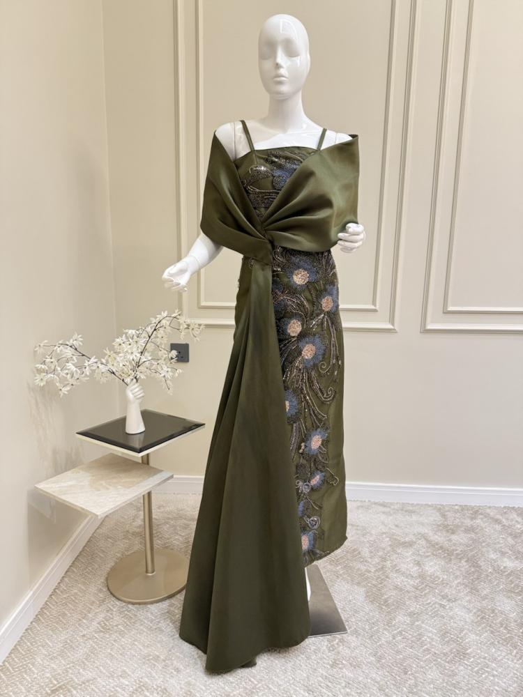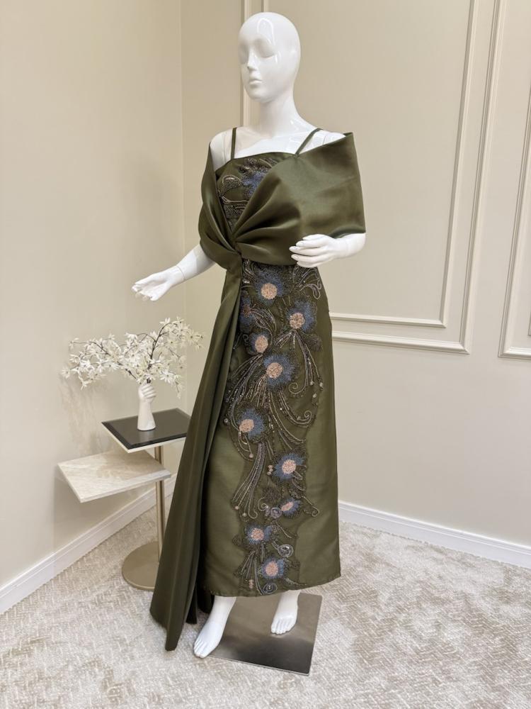 فستان زيتي سهرة مطرز من الأمام والخلف، يجسد أناقة لا تضاهى بفضل تطريزه الرائع المستوحى من نقوش الطاووس الفاخرة.