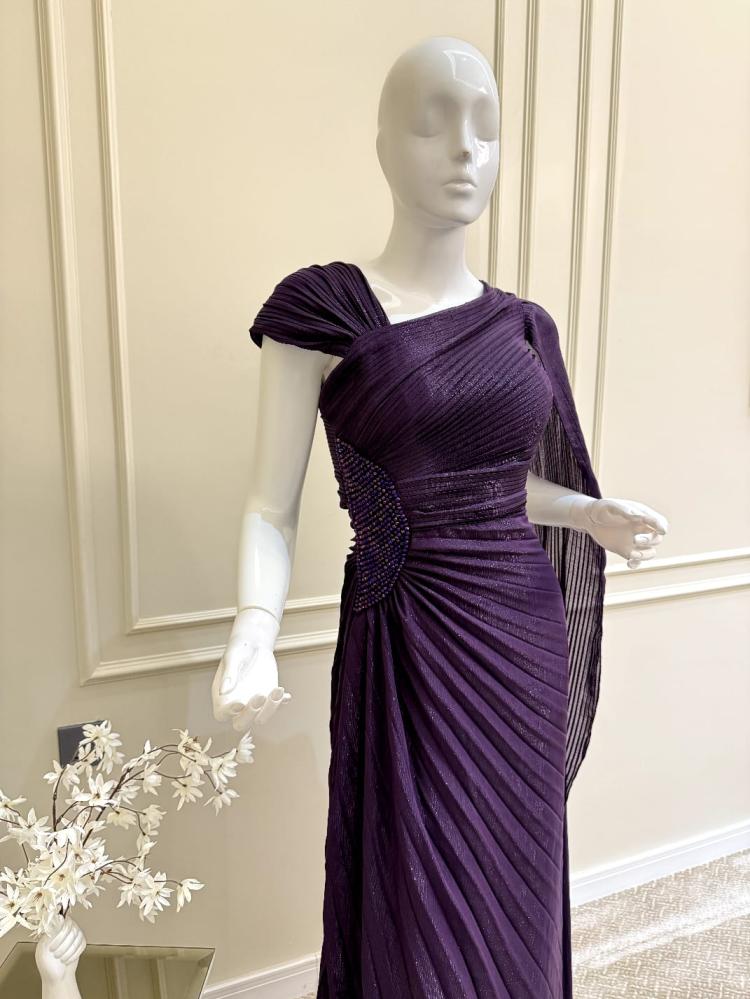تألقي في مناسباتك الخاصة بإطلالة استثنائية مع هذا الفستان الساحر باللون الموف الملكي. يتميز بقَصّة أنثوية راقية وتصميم بكسرات ناعمة تنساب بانسيابية تضفي على القوام طولًا وأناقة.